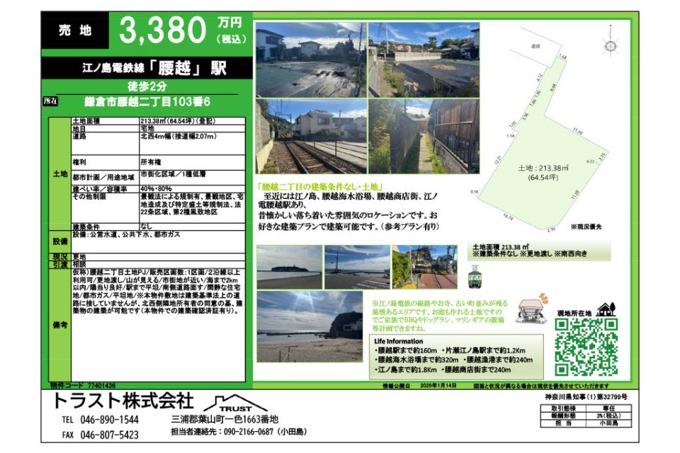 腰越商店街、腰越海水浴場近くの昔懐かしい雰囲気が残る住宅街にある土地をお預かり致しました。